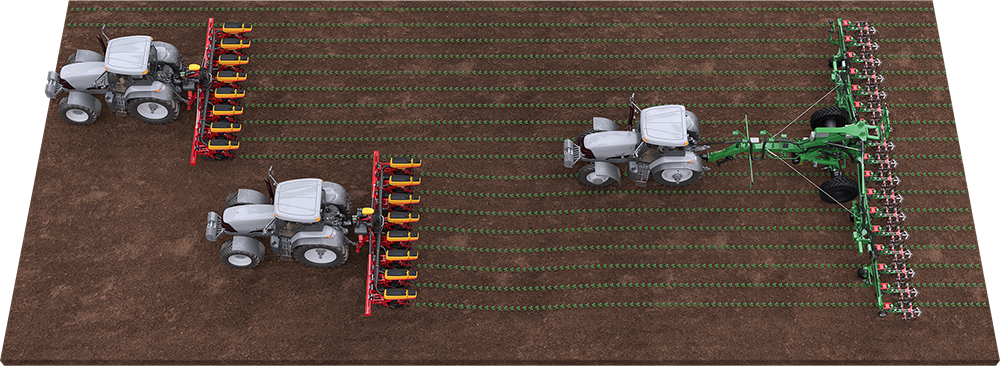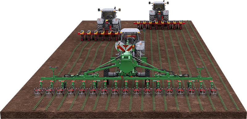 In a field seeded with a Tempo V or F with a 6 meter frame and 75 cm row spacing, you would usually use an 8-row inter-row cultivator to be able to follow the track very precisely. With our double-frame solution you can use a 12-meter cultivator which holds two frames, six meters each, and 75 cm row spacing, and get a precise result without damaging your crops.