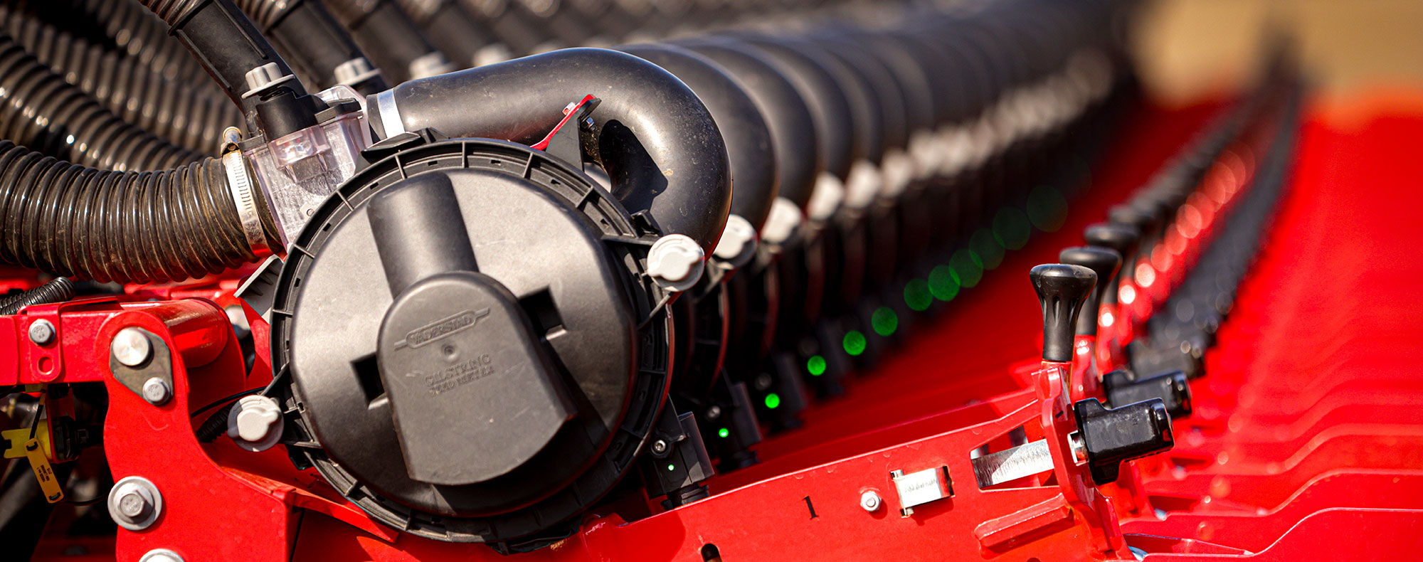 The Tempo seed meter uses positive air pressure to ensure each single seed finds its place on the rotating seed discs, one by one. When the seed reaches the seed tube, the air pressure is cut off to accurately guide the seed into the tube.