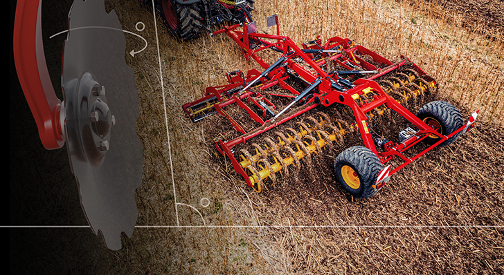 Dvě řady disků z kvalitní tvrzené švédské oceli V-55 agresivně řežou a míchají posklizňové zbytky do pracovní hloubky až 12 cm. Kuželovitý tvar disků zajišťuje dlouhou provozní životnost a dobré rozdrolení půdy.