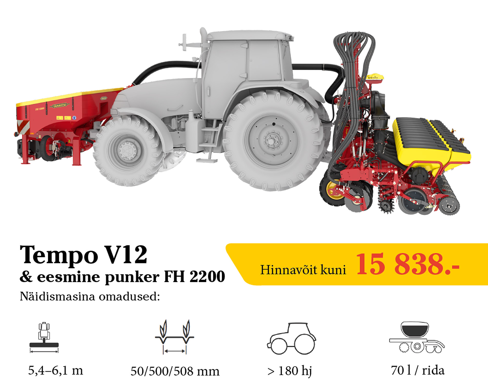 Näidismasina varustuses eesmine randaal SystemDisc Aggressive, külgmarkeerid, kergete muldade komplekt, E-Control koos iPad`ga, SeedEye seemneloendur, järeläke Heavy, FIX väetamissüsteemiga. UUED SEEMENDID!