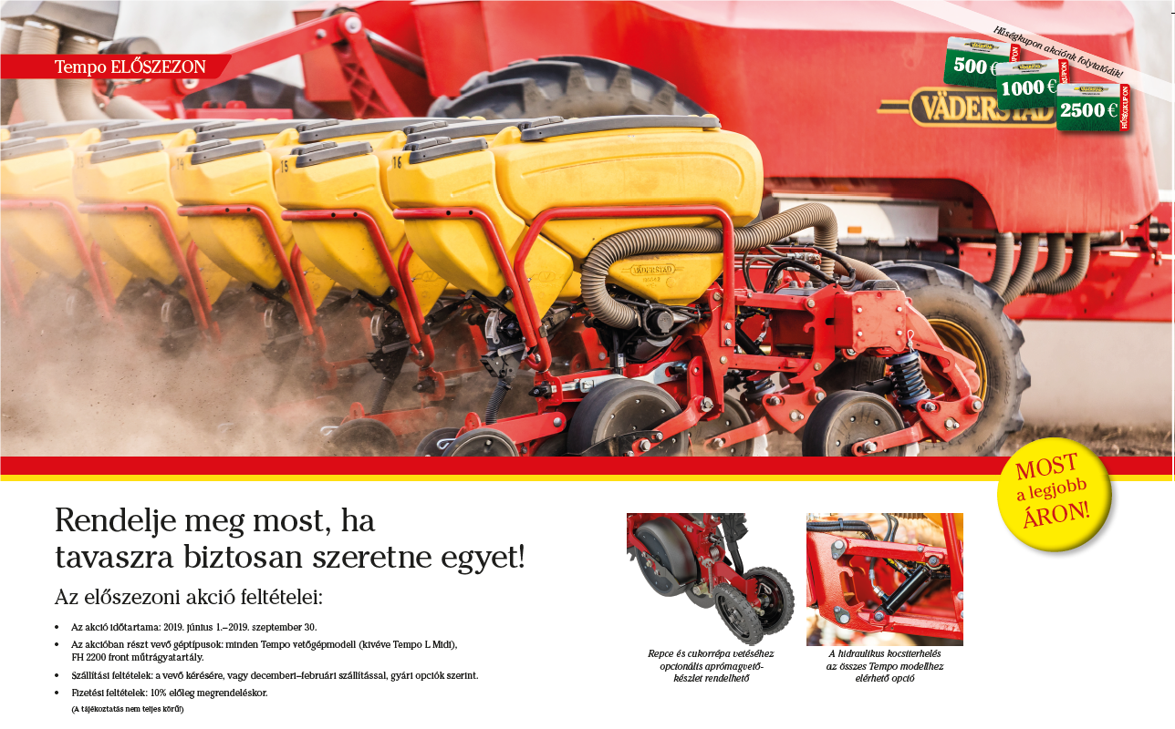 2020. október 1-től 2021. január 31-ig tartó előszezoni akcióban a legjobb árakon, valamint a legvonzóbb fizetési és szállítási feltételekkel vásárolhat új Väderstad munkagépeket!
