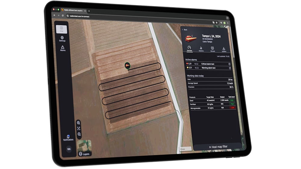 E-Connect suteikia galimybę visiškai kontroliuoti Väderstad techniką, bet kada ir bet kur. Sekite savo laukų darbų eigą, stebėkite savo technikos parką realiuoju laiku ir paverskite mašinos duomenis išmaniais sprendimais, padedančiais išnaudoti visas kiekvieno sezono galimybes.