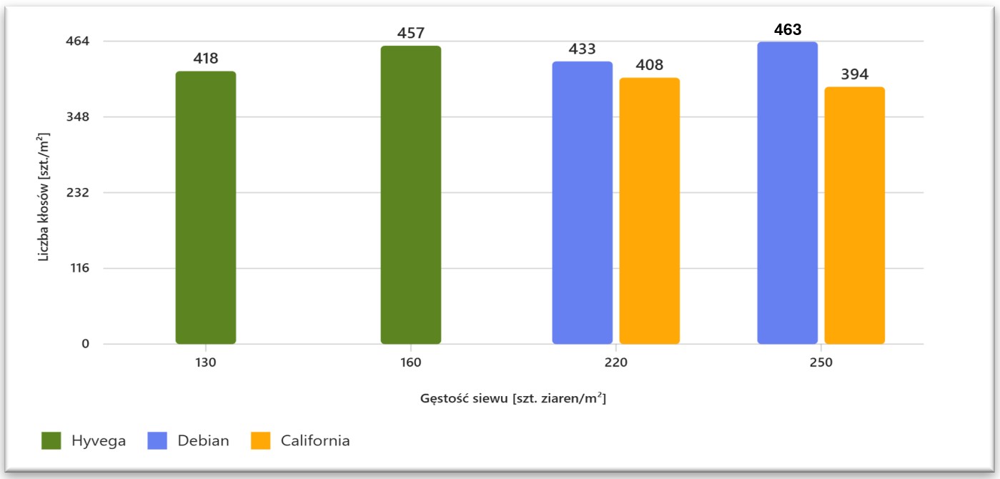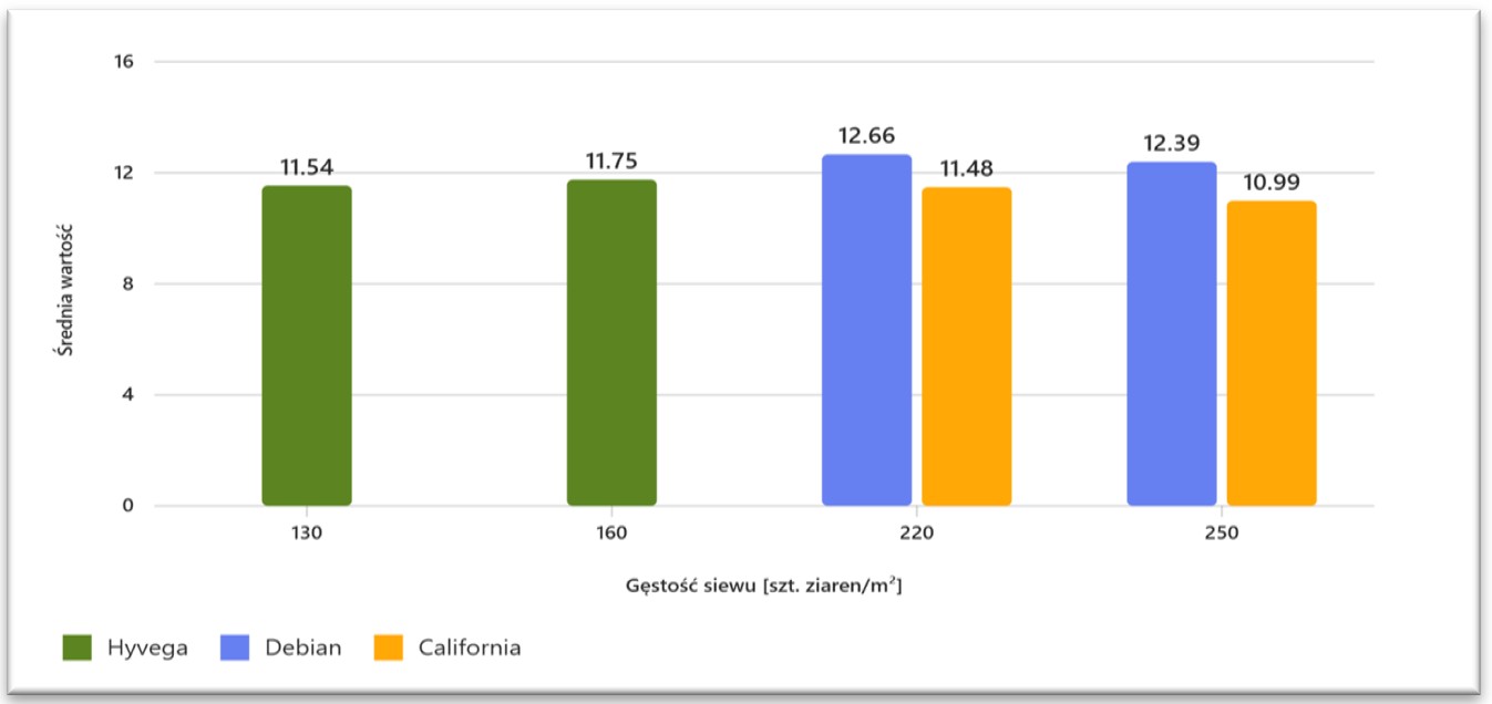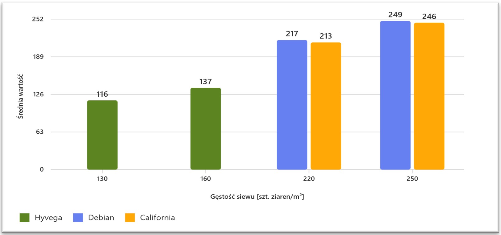 U odmiany Debian zwiększenie gęstości siewu spowodowało spadek krzewistości produkcyjnej o 10%, natomiast u odmiany mieszańcowej Hyvega obserwowano wzrost tego wskaźnika o 16%, co może świadczyć o ograniczaniu nieproduktywnego krzewienia w warunkach zagęszczenia łanu u odmiany mieszańcowej